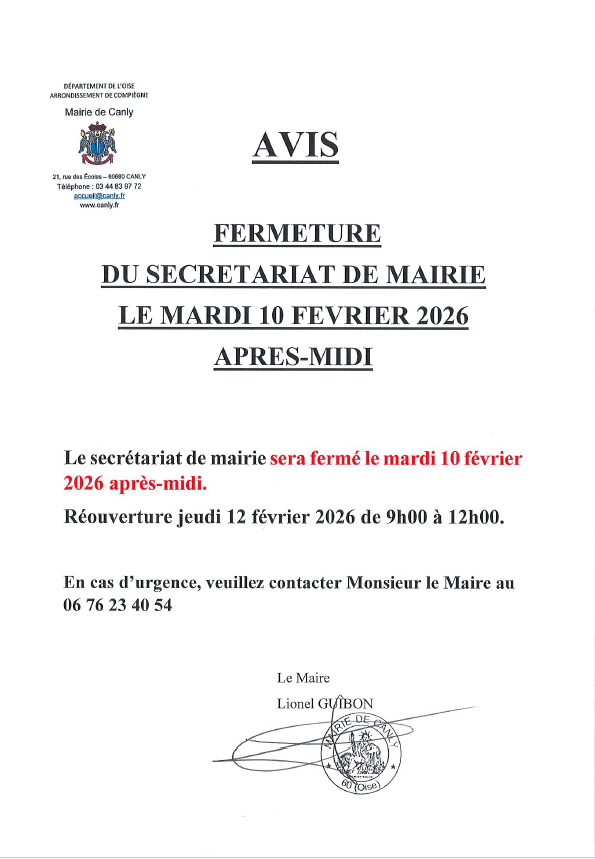 Le secrétariat de mairie sera fermé le mardi 10 février 2026 après-midi.