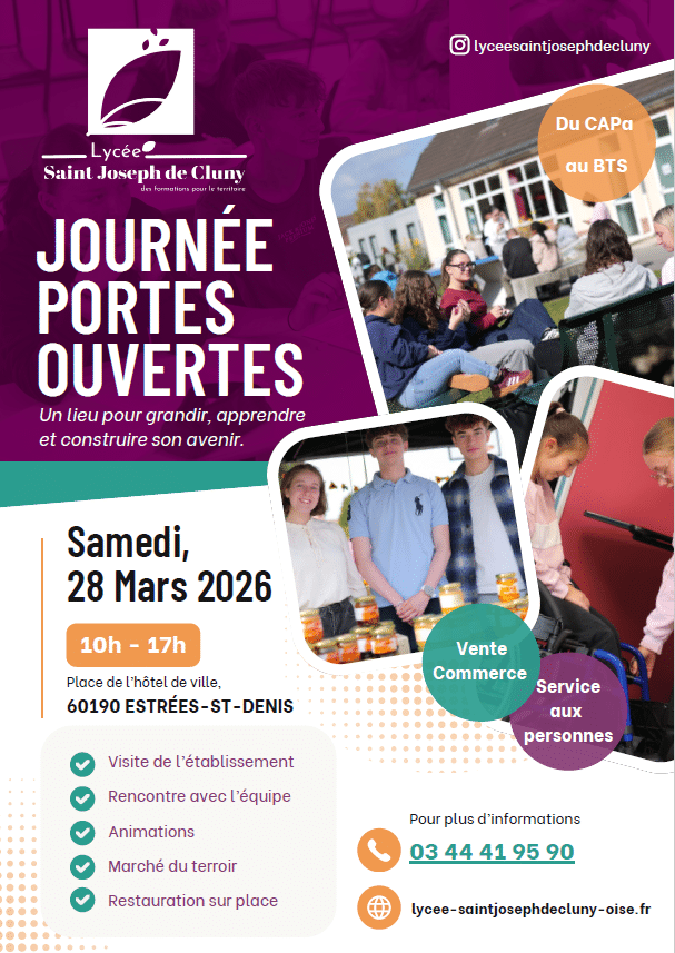 Les inscriptions scolaires et en apprentissage ayant débutées dans l’établissement Saint Joseph de Cluny pour la rentrée 2026/2027, vous pouvez vous rendre à la journée portes ouvertes qui aura lieu le samedi 28 mars 2026, de 10h à 17h – Place de l’Hôtel de Ville – 60190 ESTREES SAINT DENIS.
