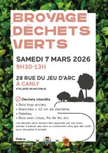 Samedi 7 mars 2026, de 9 h 30 à 13 h, rendez-vous aux ateliers municipaux (28 rue du Jeu d’Arc à Canly) pour faire broyer vos déchets verts sur place.