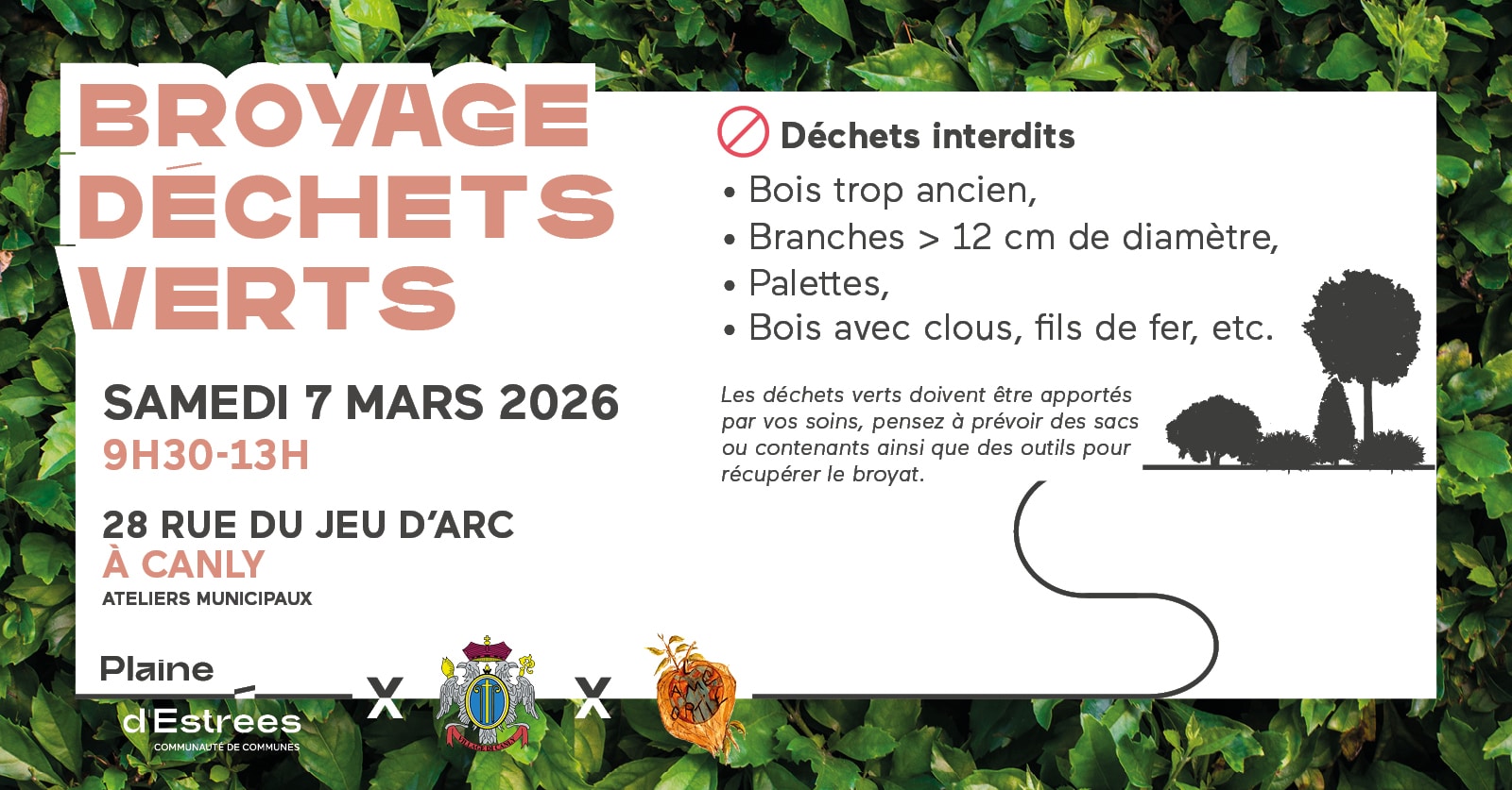 Opération broyage de déchets verts . La Communauté de communes de la Plaine d’Estrées, en partenariat avec la commune de Canly et l’association l’Ame Ortie, organise une opération de broyage de déchets verts ouverte aux habitants. Samedi 7 mars 2026, de 9 h 30 à 13 h, rendez-vous aux ateliers municipaux (28 rue...