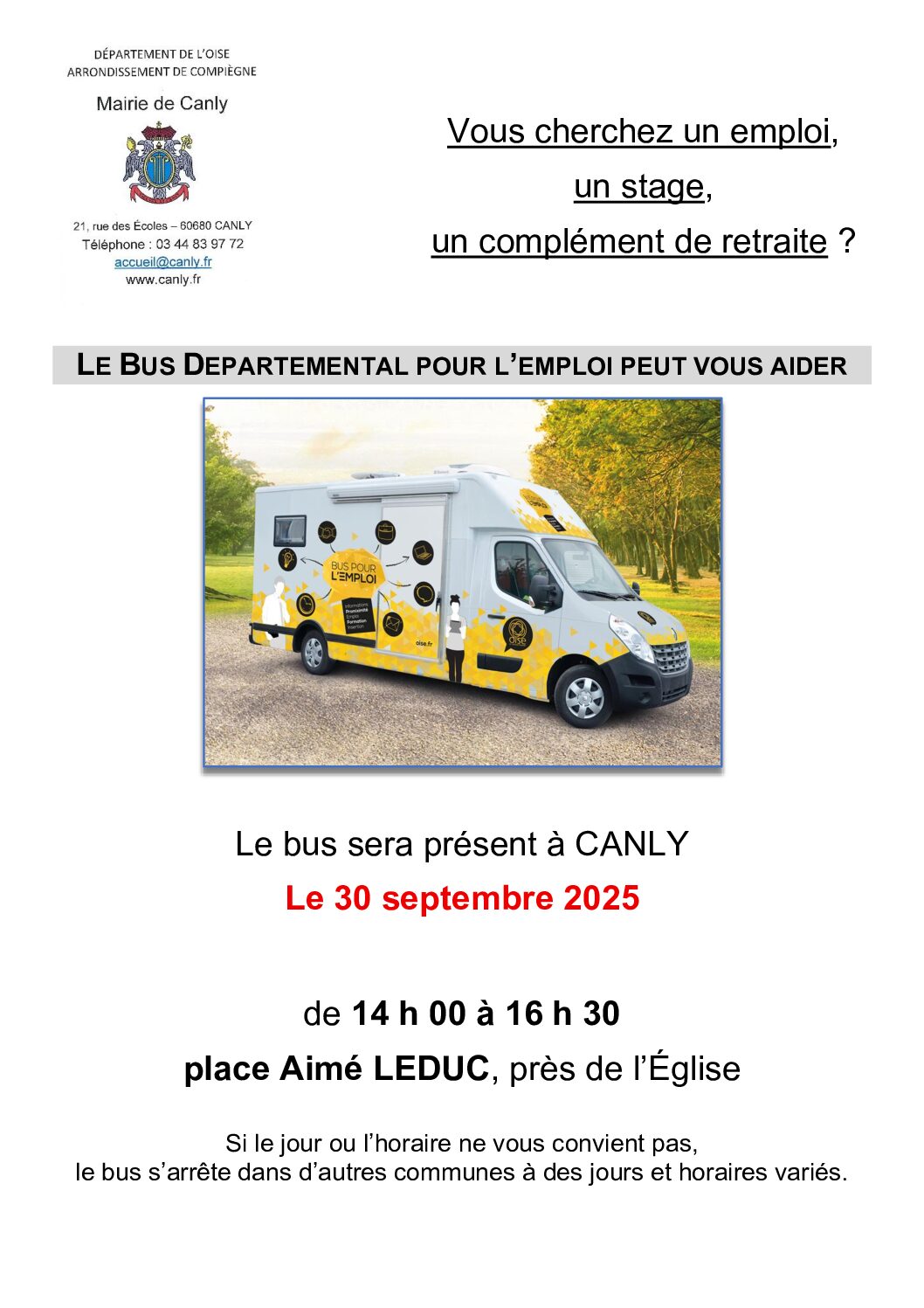 ![]() Bus pour l'emploi. Le bus départemental sera présent à Canly le mardi 30 septembre 2025 de 14h00 à 16h30, place Aimé Leduc. Affiche bus pour l'emploi